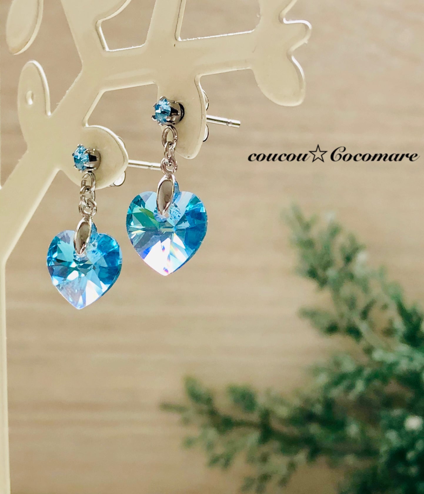 スワロフスキーのハートピアス【アクアマリンシマー】サージカルステンレス