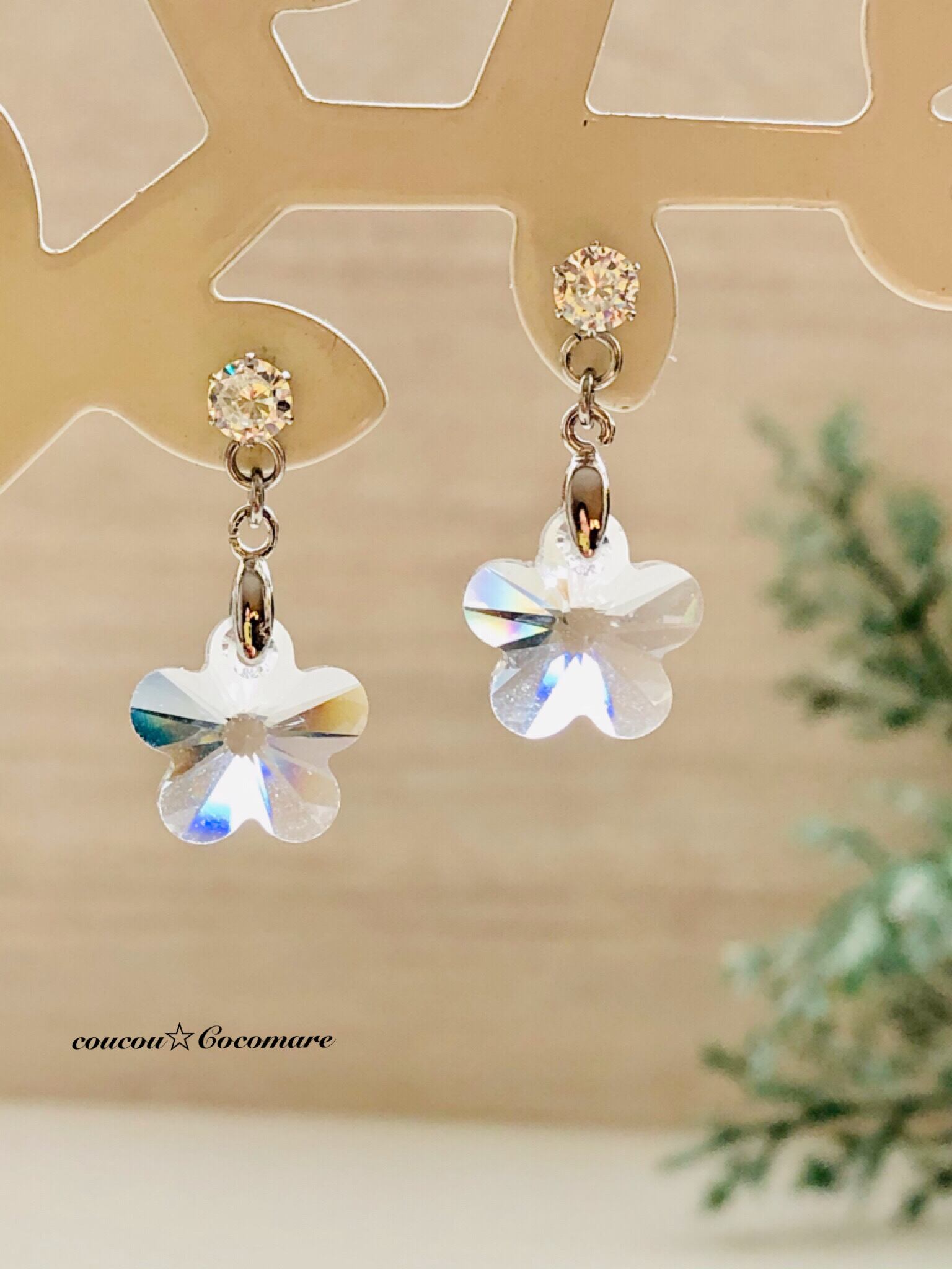 4㎜サイズのキュービックジルコニア【クリスタル色】ピアスに花のスワロフスキー【クリスタル色13.5×7.5㎜】を飾り付けたシンプルで可愛いピアスです。