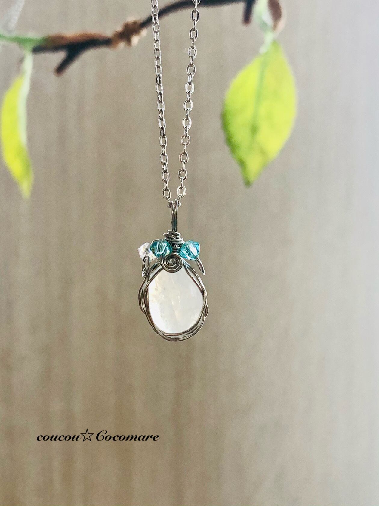 「月の力が宿る石」として人気の高い天然石【スリランカ産】ブルームーンストーンをサージカルステンレスワイヤーで固定し、天然石の上にスワロを4粒飾り付けネックレスに致しました。