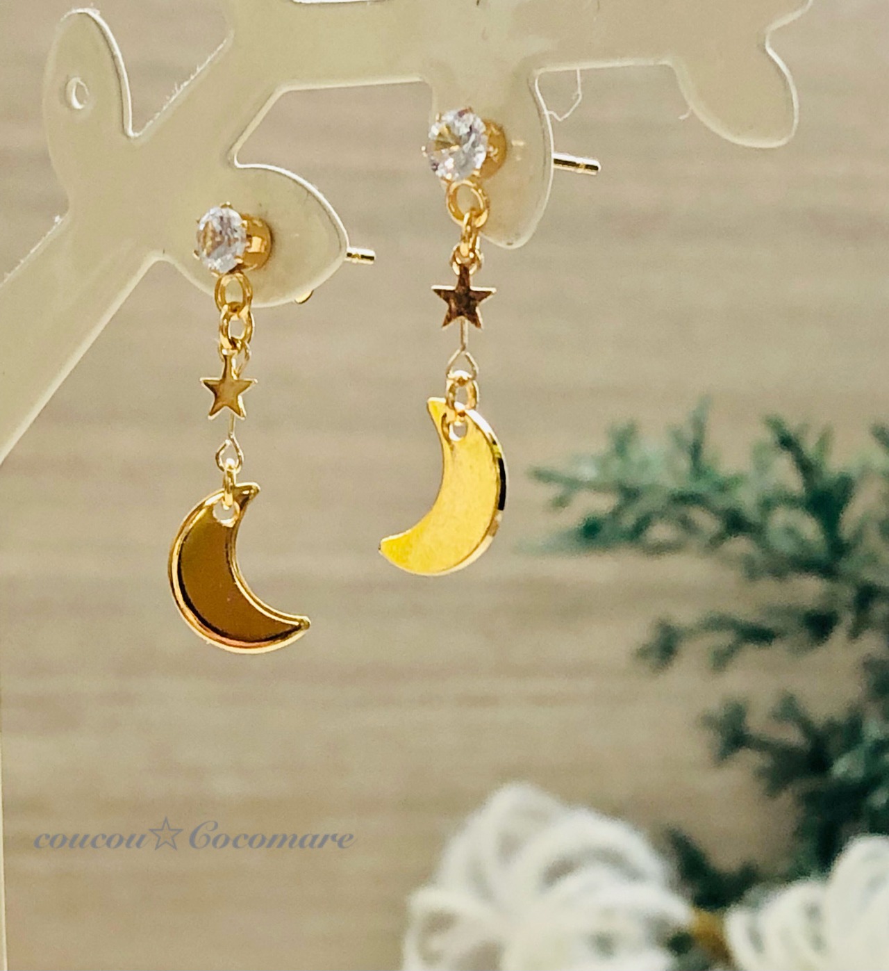 4㎜サイズのキュービックジルコニア 【クリスタル色】を飾り付けたピアスにキラキラゴールドプレートの三日月がゆらゆら揺れ、また三日月チャームの上にはさりげなく小さな星を飾り付けた可愛いピアスです。
