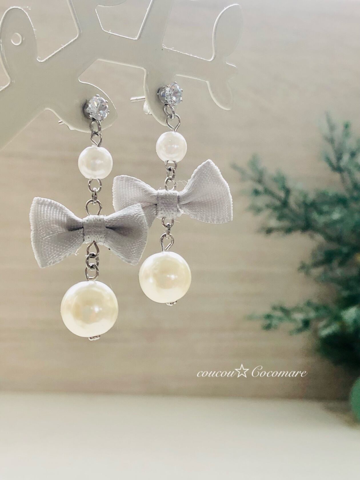 韓国風 リボンとパールピアス【サージカルステンレス】グレー