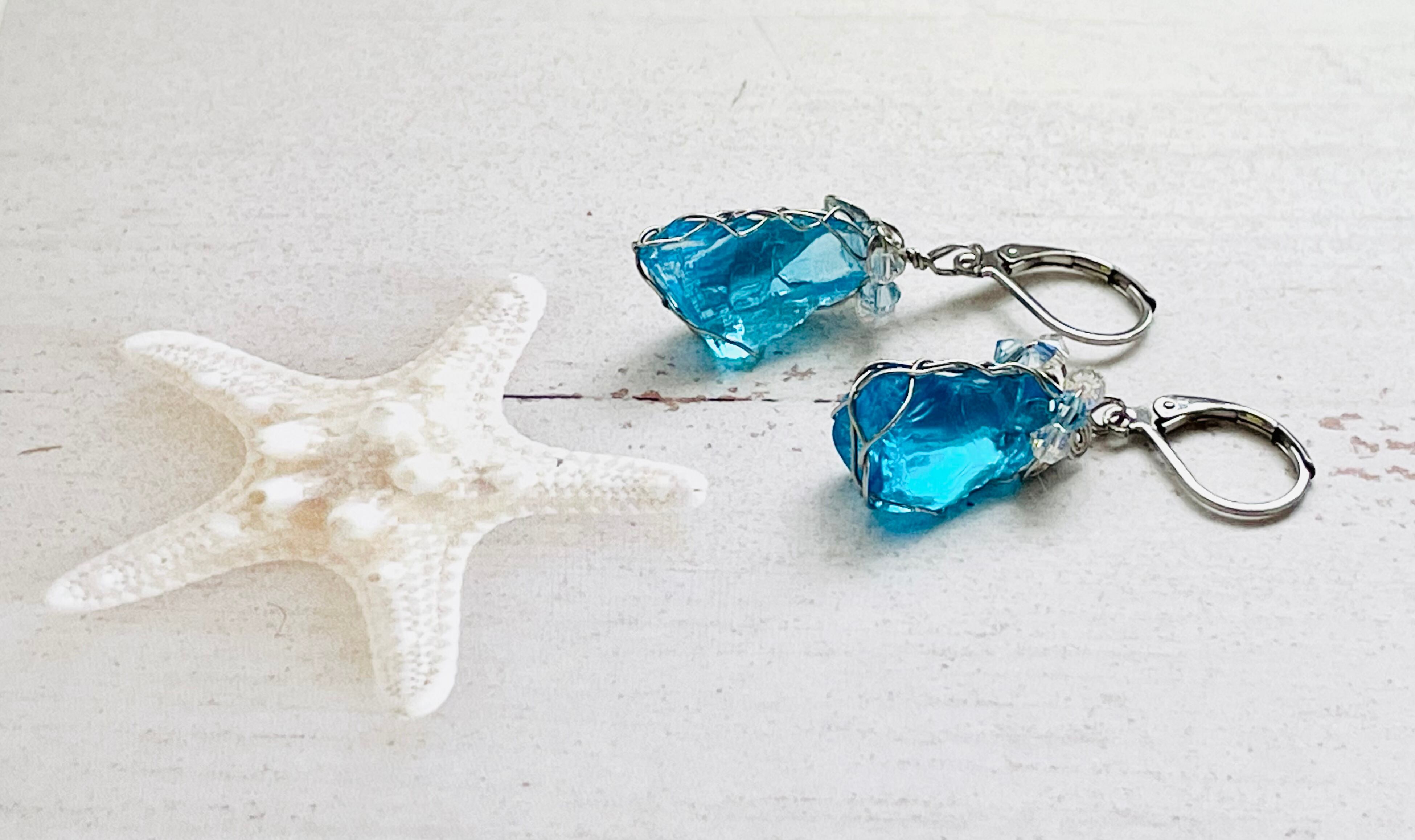 サージカルステンレスワイヤーで固定し、琉球ガラスを宝石の鉱石の様にピアスに致しました。